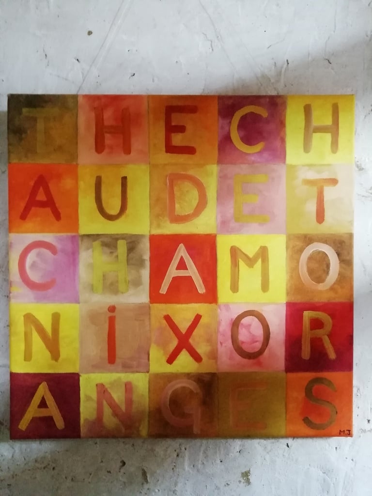 Mes tableaux sont structurés de façon très carrée (c'est le format que j'utilise d'ailleurs le plus souvent). En composition, j'aime y glisser un motif intrus, rond la plupart du temps, histoire de montrer que rien n'est figé, qu'il faut parfois savoir arrondir les angles et que finalement, la différence donne toute sa valeur à l'harmonie.